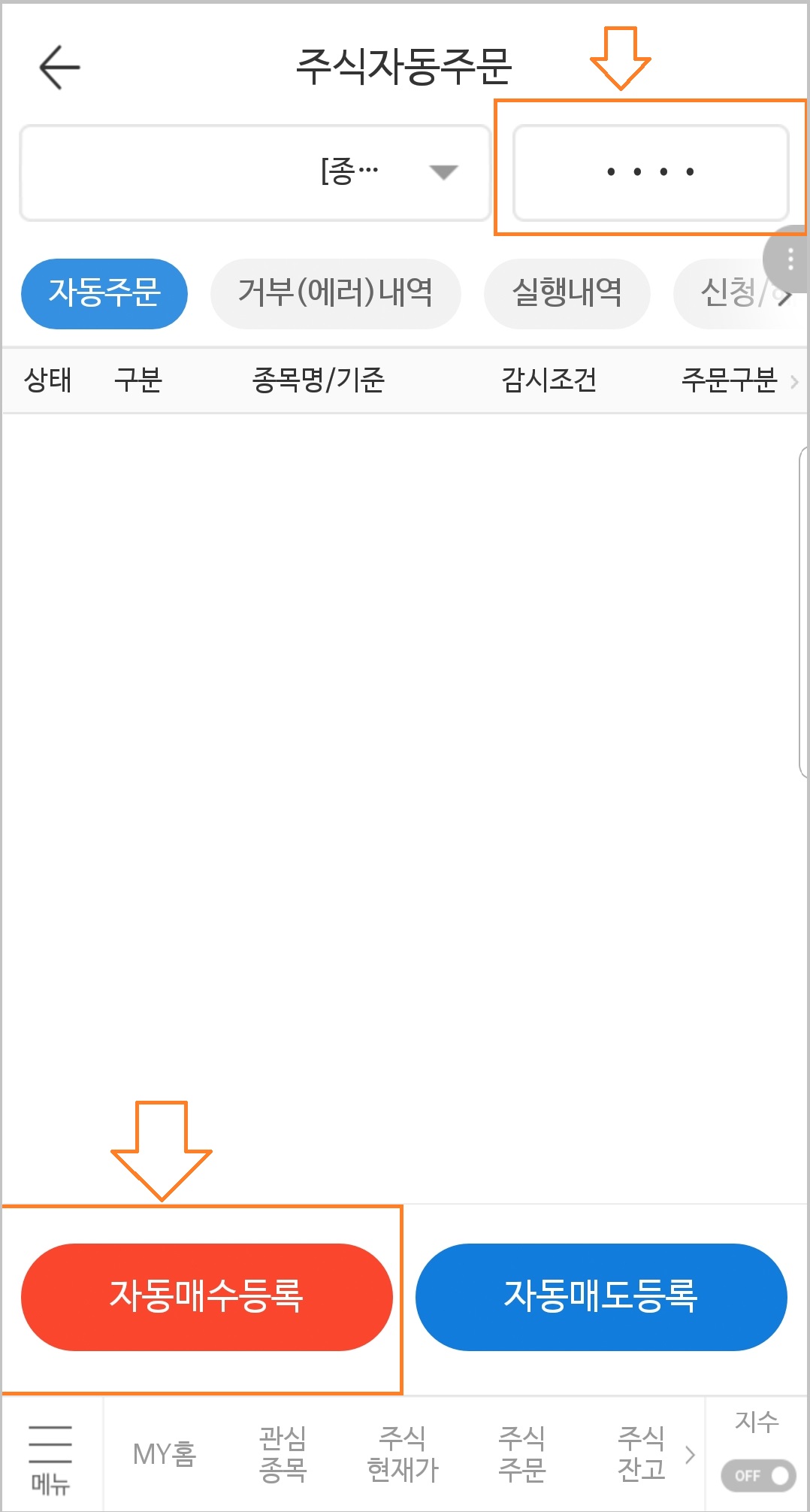 2. 원하는 종목을 검색합니다. 3. 구매 자동주문 등록 방법 – 모니터링 기준: 현재 가격 지정 – 모니터링 조건: 주문 수량 미만일 경우 현재 가격으로 주문(희망 수량) – 주문 수량: 현금(희망 수량) – 모니터링 기간: 최대 기간 1개월 – SMS 수신 : 주문내역 확인하기 4. 자동거래주문확인창 확인하기 2022년 3월 8일부터 2022년 4월 7일까지 삼성전자 1주 가격이 69,900원 이하가 되면 2주 매수에 배팅합니다. 자동 주문의 세부 정보를 봅니다. 이것은 자동 재고 주문의 세부 정보가 표시되는 방식입니다. 상단의 상태 섹션에서 파란색을 켜거나 꺼서 자동 주문 상태를 변경할 수 있습니다. 보다 편하게 주식 거래에 참여할 수 있습니다. 고마워요! ! ㅎㅎ 쥬린이들 우리도 할 수 있어! 고심하다! !